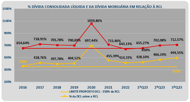 Nesse 3ºQ2023, a Dívida Mobiliária voltou a ser descumprida, atingindo o valor de 712,57%, acima do limite de 650%, assim como o valor da DCL, que foi de 494,55% em relação a RCL, portanto acima do referencial de 350%.